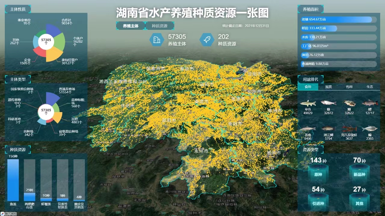 该管理平台是以湖南省第一次水产养殖种质资源普查数据为基础搭建的智能化平台,涵盖了养殖主体5.7万余个、202个品种、16.6万余条种质资源信息,绘制出全省水产养殖种质资源“一张图”,实现了省、市、县水产养殖种质资源数据的动态分析和可视化。平台主要建设了养殖资源管理、统计分析、供需管理和资讯管理等四大业务模块。平台还开发了微信小程序,不仅方便查看、更新数据,养殖户还可以发布和查询供销信息。